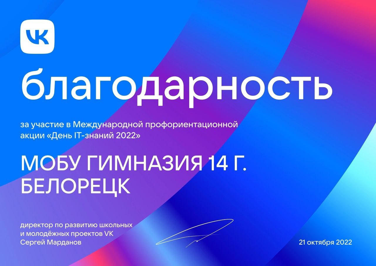 VK в шестой раз прошла ежегодная профориентационная акция для школьников "День IT-знаний" 21 октября 2022 года, в рамках которой школьники узнали, как устроены видеотехнологии, в каких сервисах они применяются и какие специалисты создают их. В Акции приняли участие обучающиеся 9-х классов нашей гимназии.