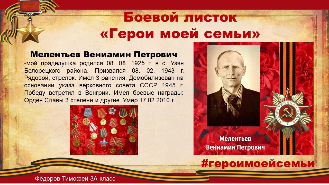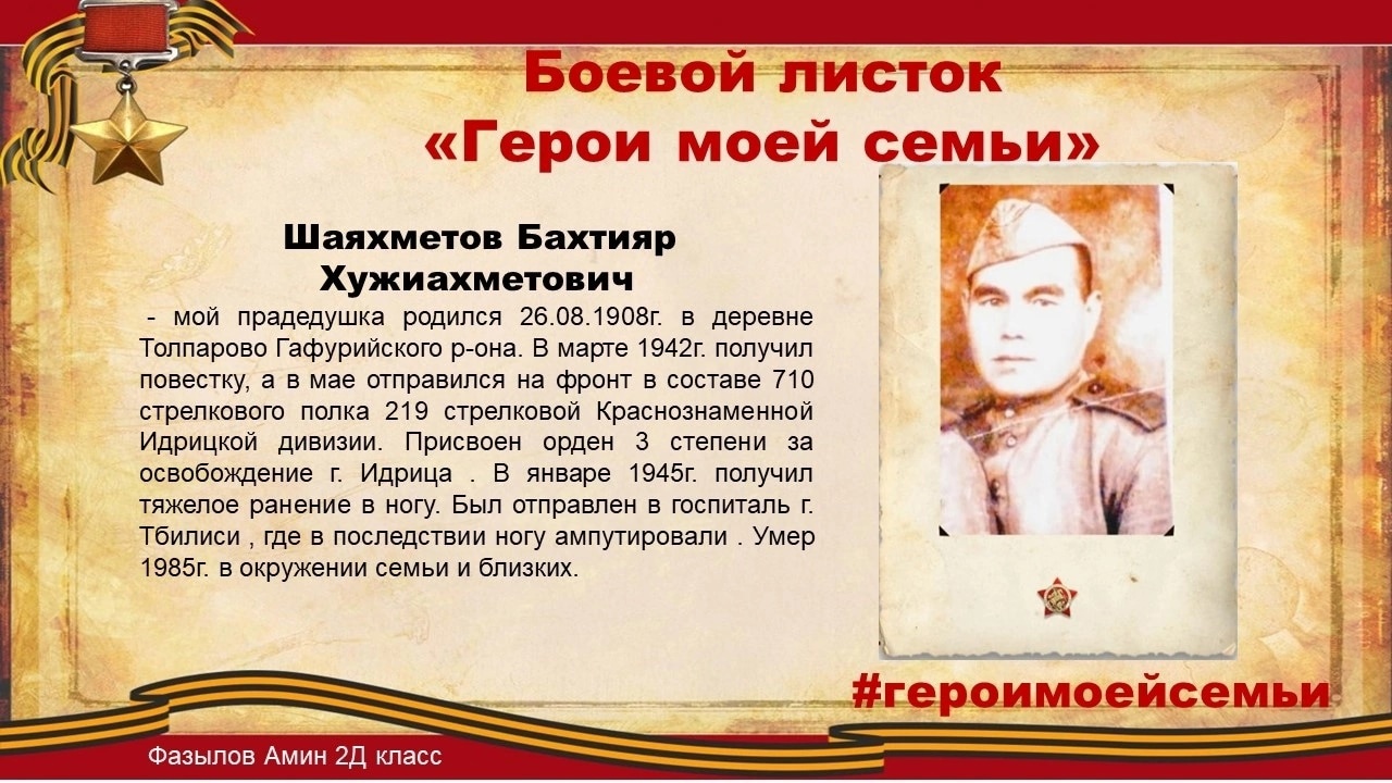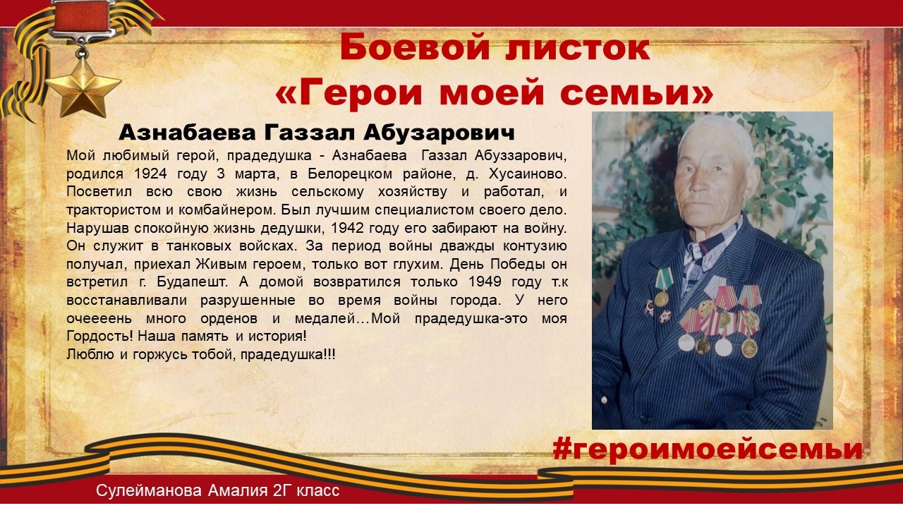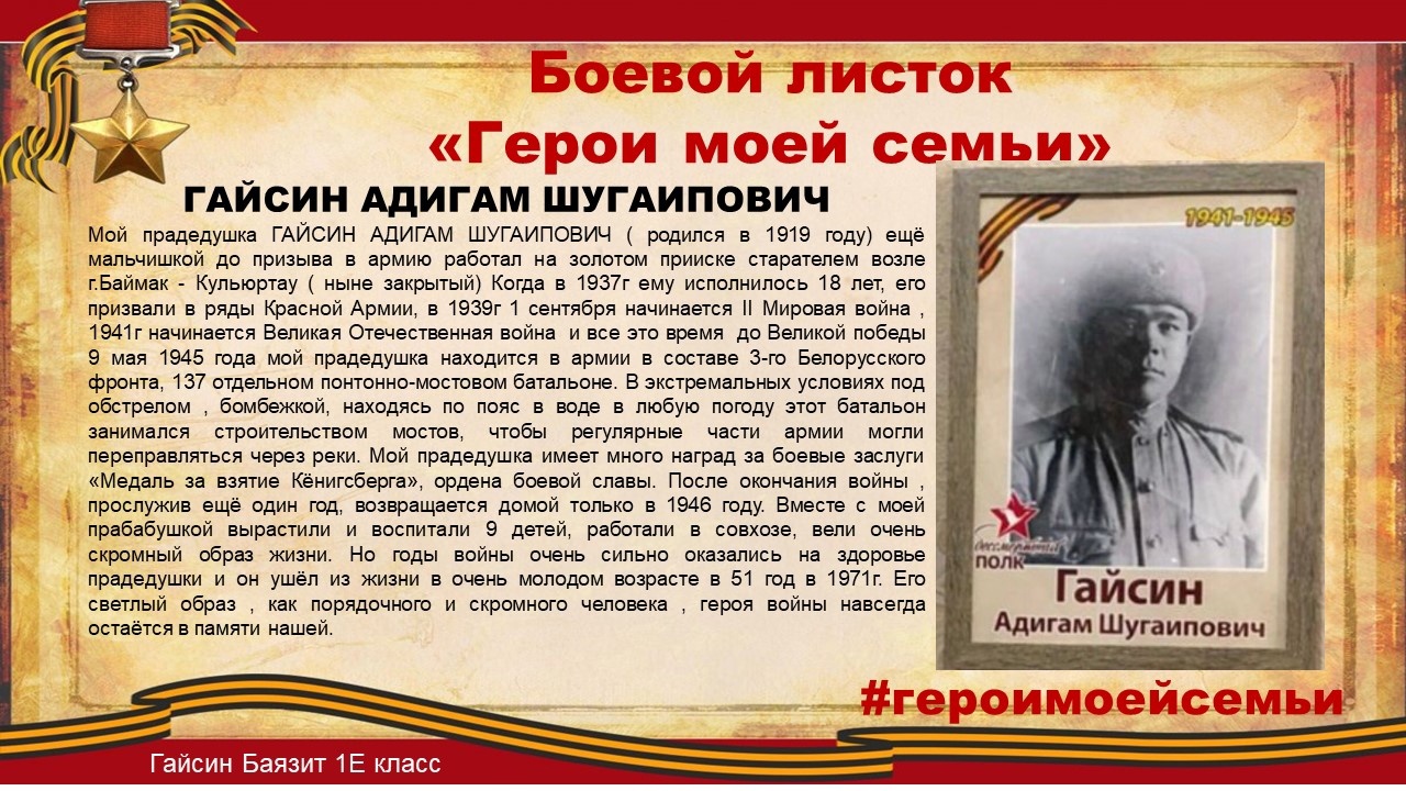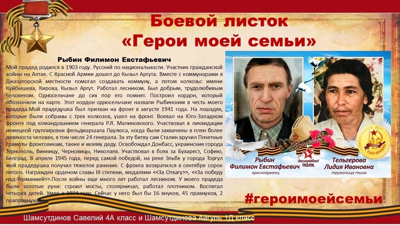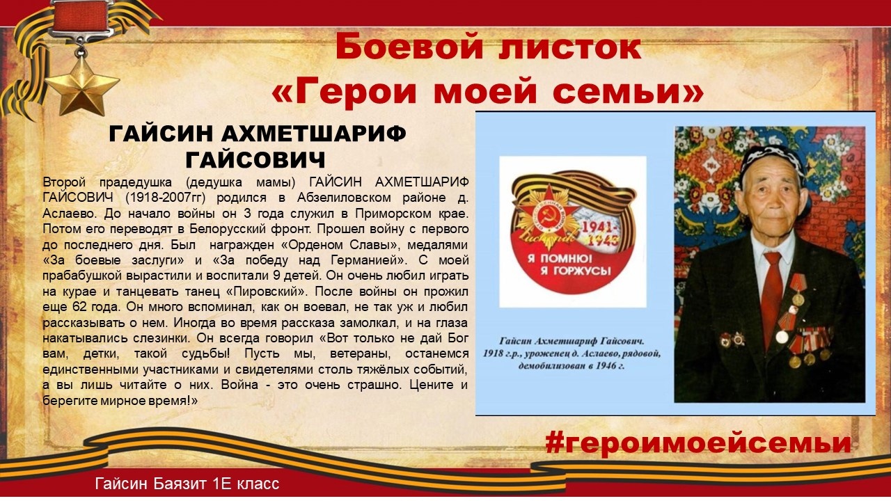 Учащиеся МОБУ Гимназия №14 г. Белорецк приняли участие в акции Боевые листки «Герои моей семьи» и рассказали о подвигах своих прадедов.