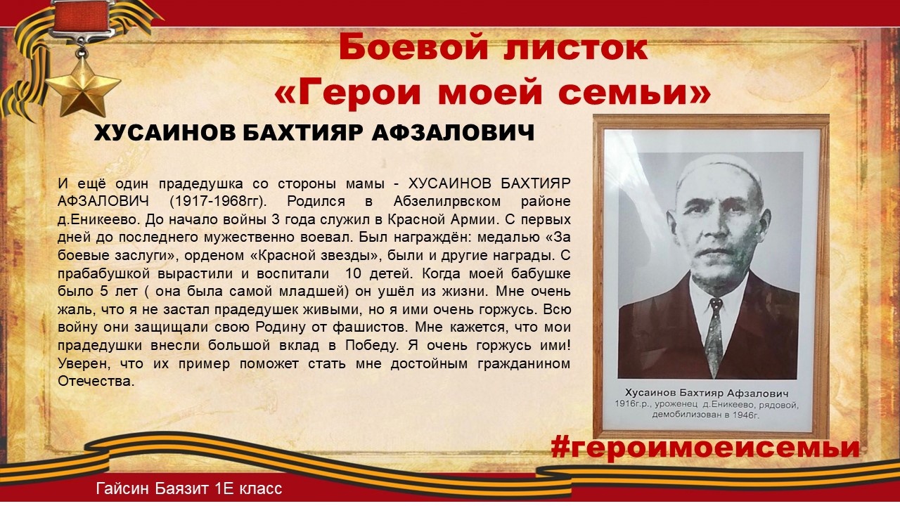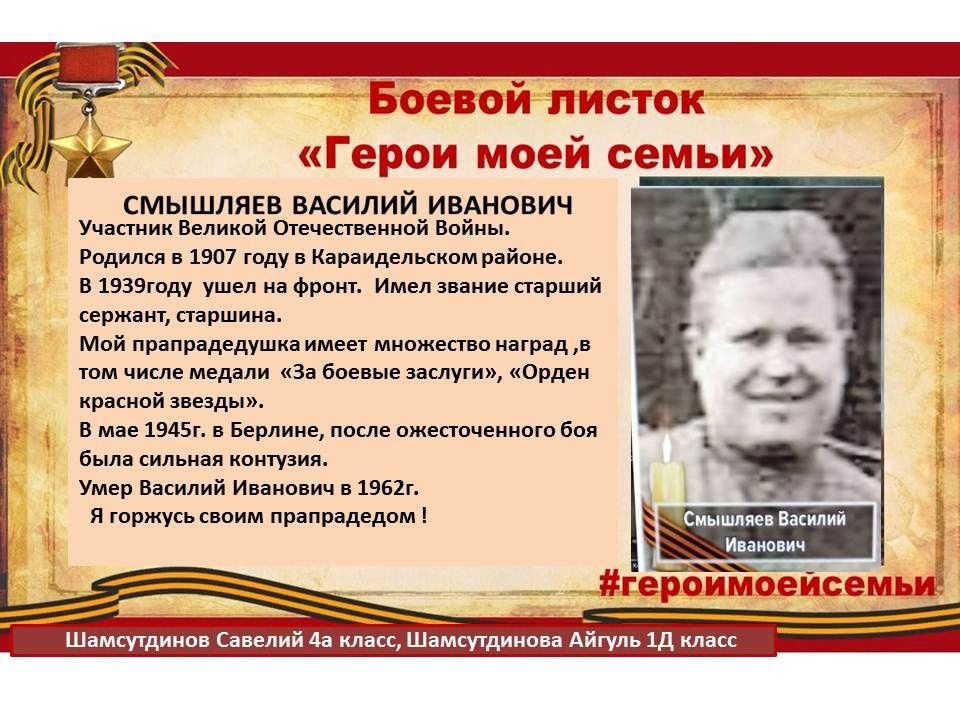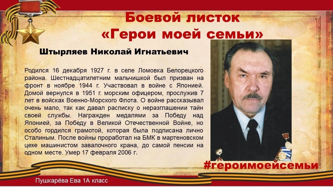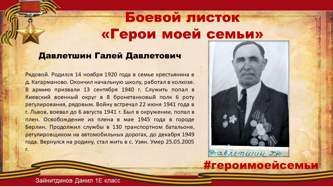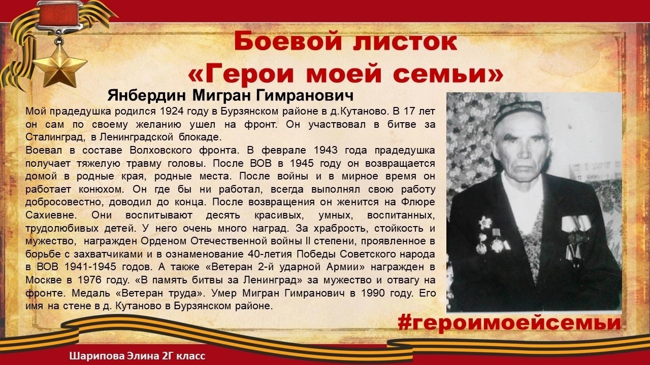 Учащиеся МОБУ Гимназия №14 г. Белорецк приняли участие в акции Боевые листки «Герои моей семьи» и рассказали о подвигах своих прадедов.